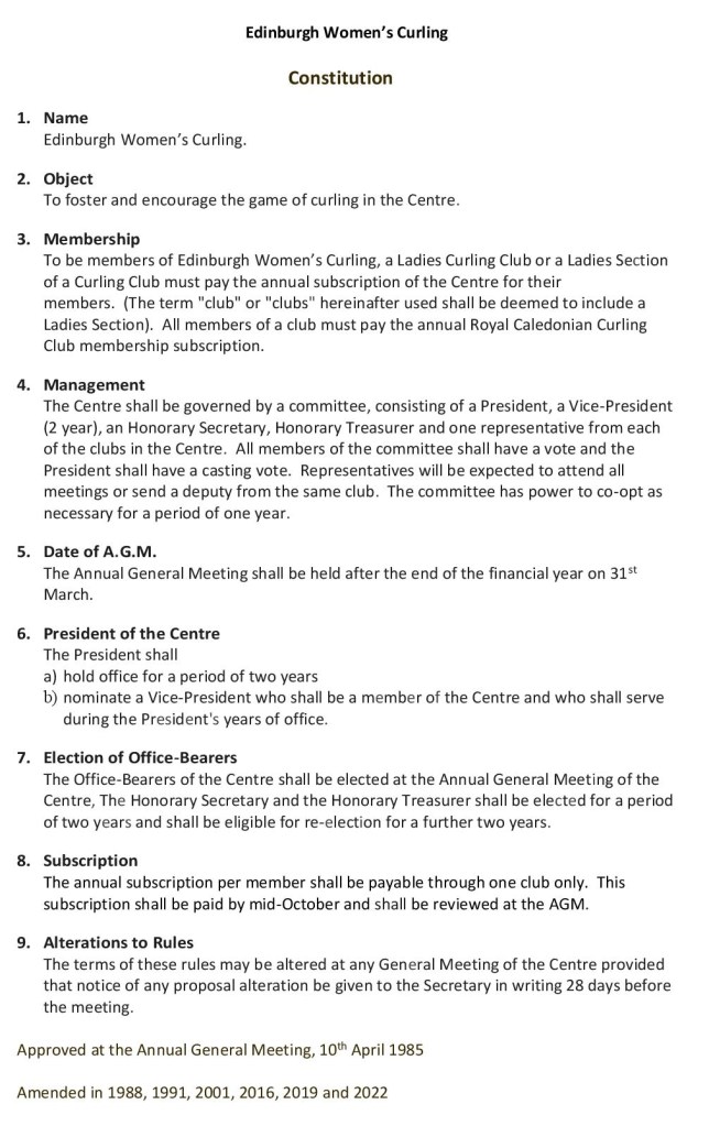 The Edinburgh/Murrayfield Ladies’ Centre’s constitution was approved at the AGM on 10th April 1985. It has since been amended in 1988, 1991, 2001, 2016, 2019 and 2022.